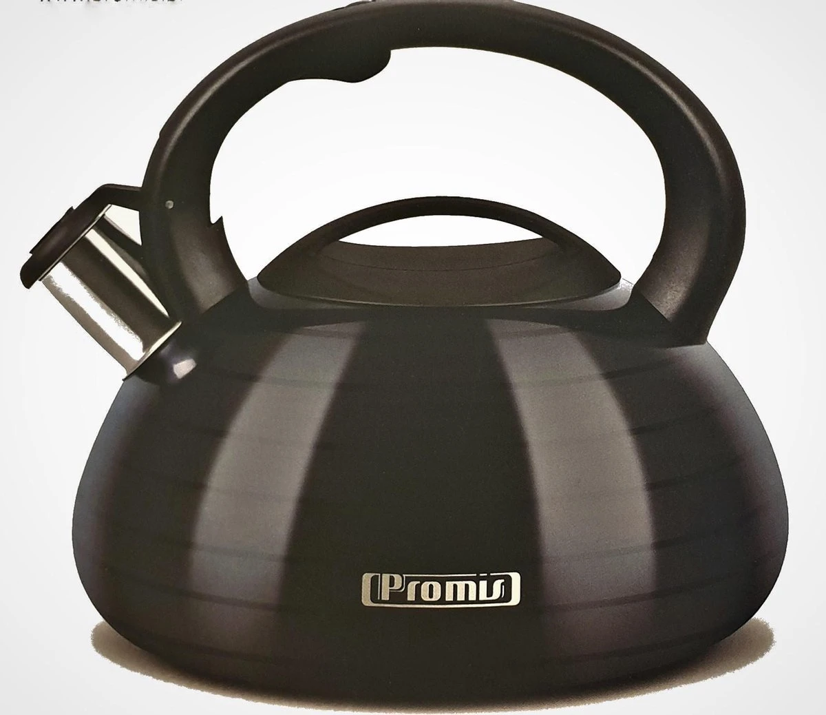 Een mooie elegante fluitketel in een mooie metallic zwarte kleur van 3L, geschikt voor gas, inductie en elektrische kookplaat.