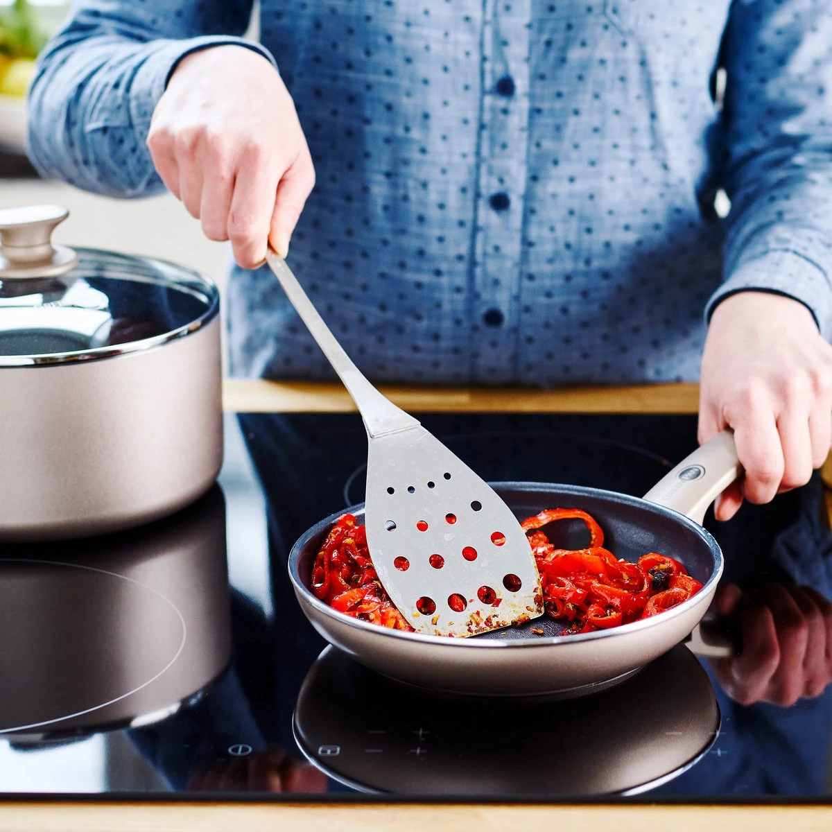 De PFAS-vrije GreenPan Cambridge Keramische Koekenpan – Ø 30 cm – Inductie in brons is heerlijk eenvoudig in gebruik en is geschikt voor alle warmtebronnen, ook inductie. De pan warmt snel en gelijkmatig op voor uitstekende bakresultaten. De Thermolon™ Infinity keramische anti-aanbaklaag is bovendien versterkt met diamant en bestand tegen metalen spatels.