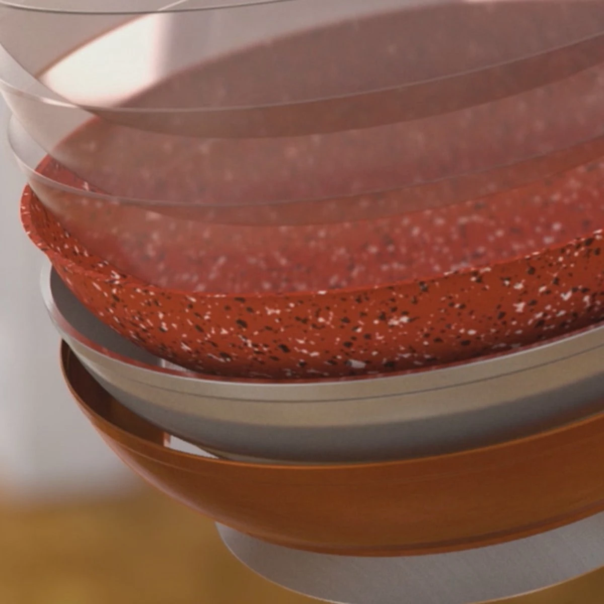 Robuuste 7-lagen constructie voor snelle, gelijkmatige warmteverdeling, maximale dimensionale stabiliteit en lang warmtebehoud. Het geheim van de pan zit hem in de lagen.